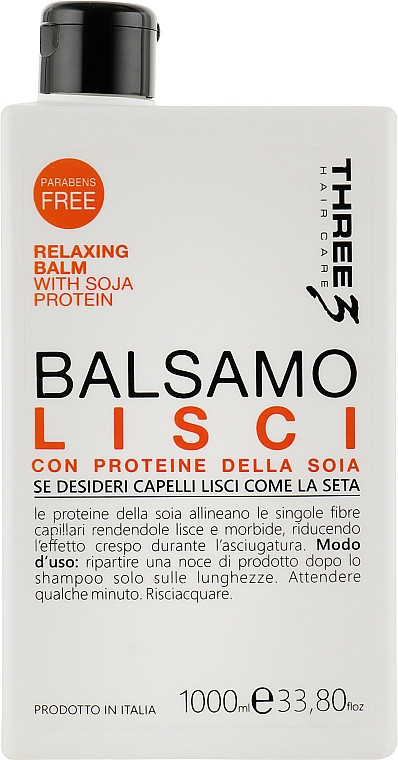 Бальзам для розгладження волосся із соєвим протеїном від італійського бренду Faipa Roma – це якісний, багатофункціональний засіб, активні компоненти якого цілеспрямовано діють на харчування та зволоження сприйнятливих завитків. Three Hair Care Lisci Balm якісно заповнює їх структурні «пробіли», відновлює пошкоджені локони та робить все, щоб ранкові укладання були максимально легкими та безболісними. Крім цього, універсальний засіб створює навколо пасмів невагому захисну плівку, яка мінімізує негативний вплив середовища, запобігає появі дрібних недосконалостей, ознак дегідратації.